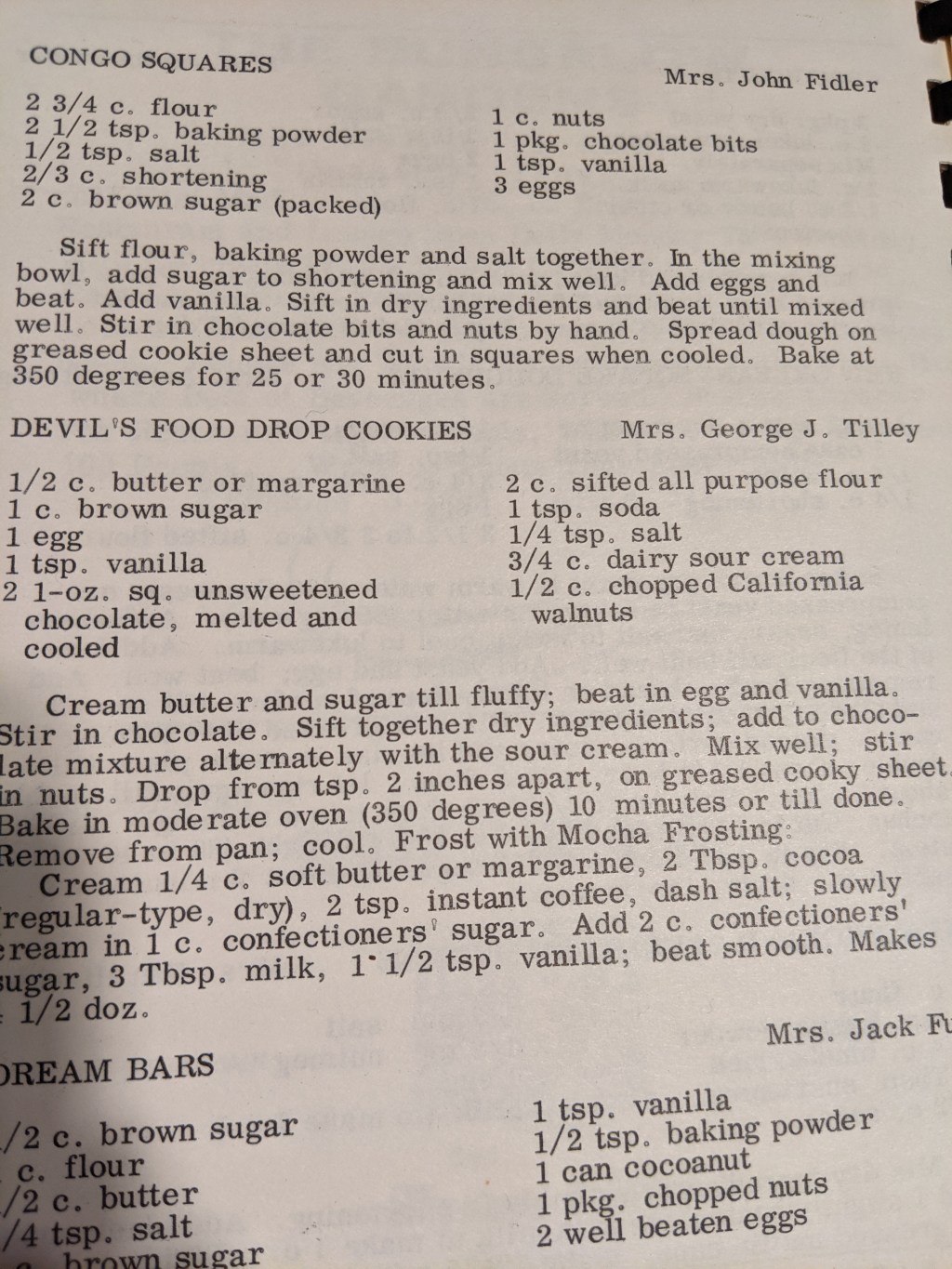 Its absolutely chock full of the kind of mid-century Midwestern cuisine that is really tough to find anymore. Being a baker, of course I started with the cookies. These little Devil’s Food Drop Cookies are sublime. They are cakey and soft, almost like a bite of brownie or cake, with a strong chocolate flavor that is offset nicely by the richness of the butter. The only thing that’s even remotely challenging with this recipe is the melting chocolate and most microwaves will do that for you in about 30 seconds (two 15 second blasts generally does it for me).