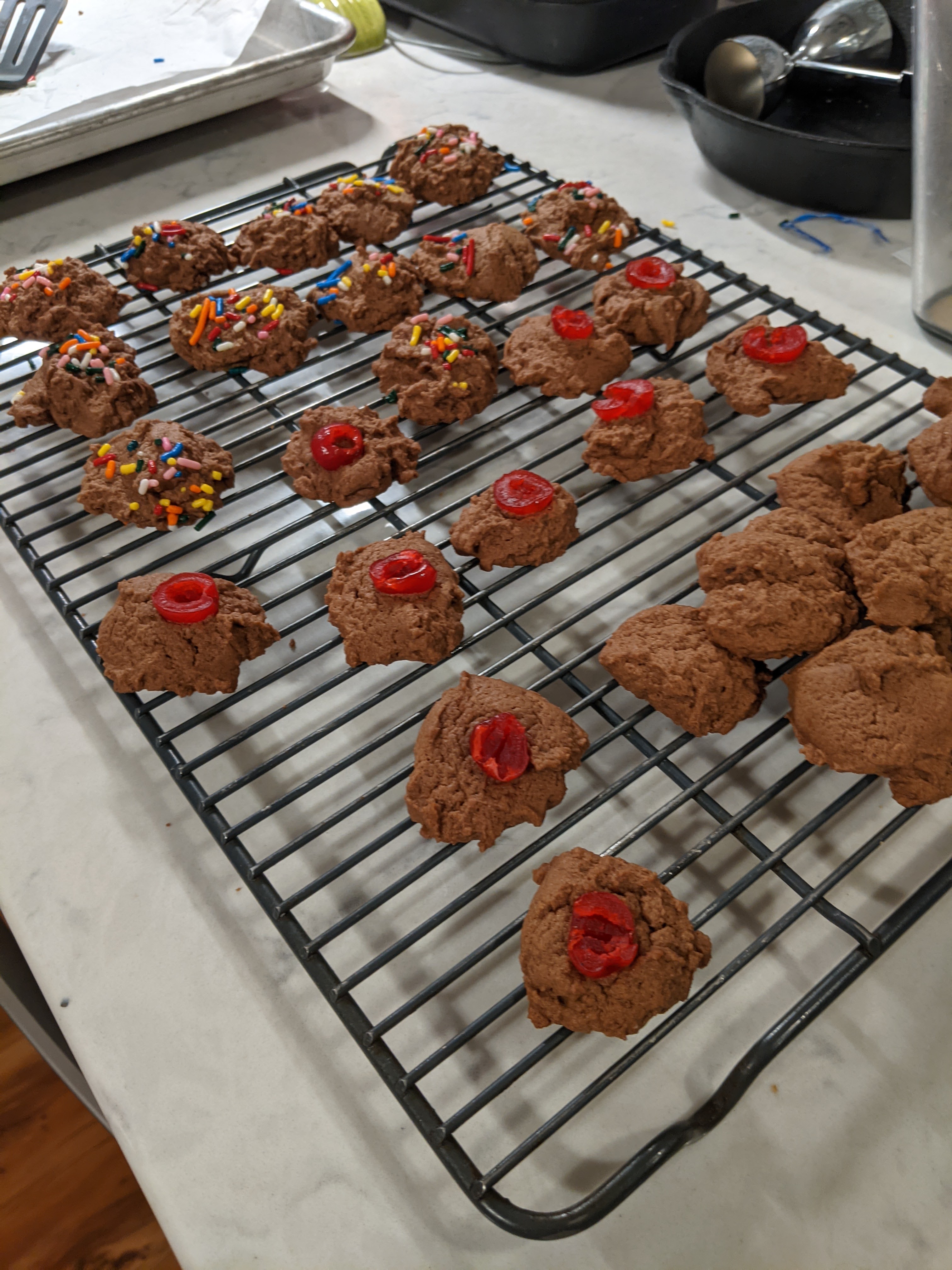 Cream butter & sugar until fluffy, add egg and vanilla and cooled chocolate. Whisk dry ingredients and add, alternating with sour cream. Mix until combined, use teaspoon to portion and bake in 350 oven for 9-10 minutes.